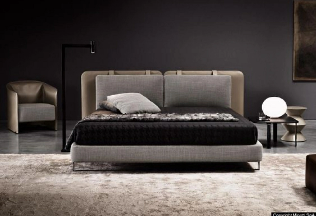 سرير “كومو” المودرن بخامات الجلد والكتان الفاخر – تصميم أوروبي أنيق بمقاسات واسعة (عرض 234 × طول 228 سم)، مثالي لغرف النوم الماستر الباحثة عن الفخامة العصرية.
