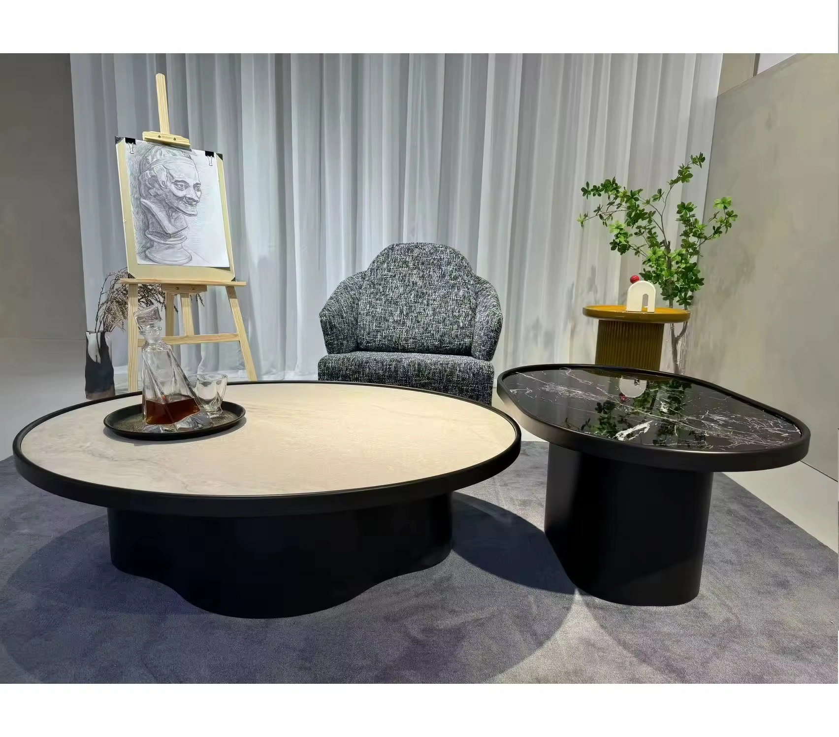 • التصميم: طقم مكون من طاولتين بتصميم دائري وبيضاوي أنيق يمكن استخدامهما معًا أو بشكل منفصل.