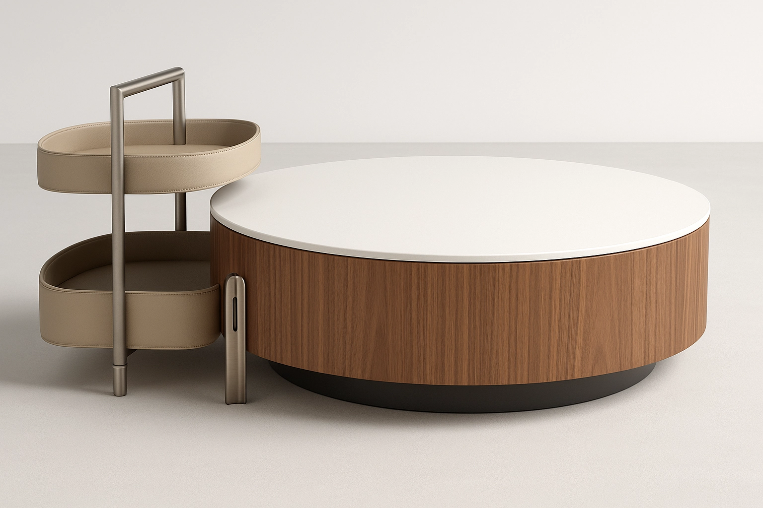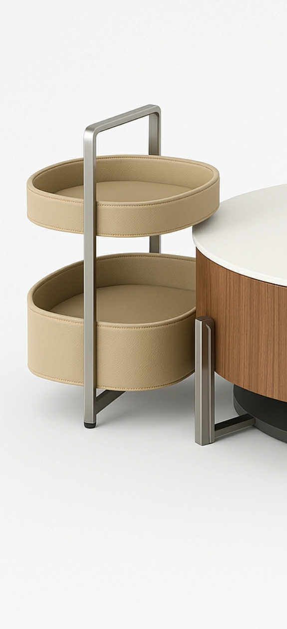 امنح غرفة المعيشة لديك لمسة من الفخامة العملية مع طقم طاولة القهوة مارلو من ستايل هوم – الفخامة والجودة في مكان واحد. تصميم يجمع بين الجمال العصري والوظائف الذكية بفضل الطاولة الرئيسية المستديرة ووحدة الخدمة الجانبية المتنقلة.
