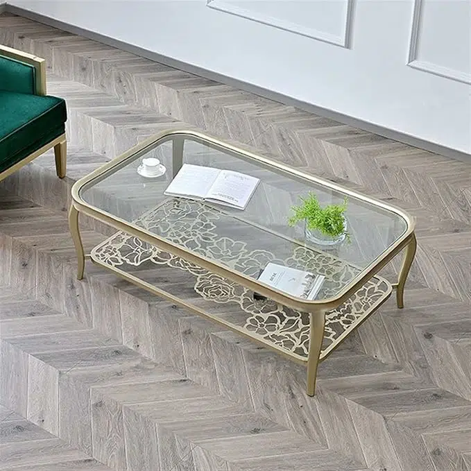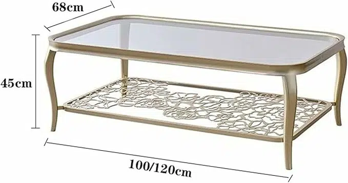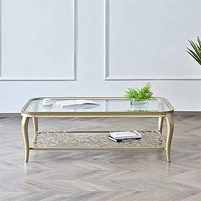 تعتمد الطاولة على هيكل مستطيل واسع يوفر سطحاً عملياً مثالياً لوضع الضيافة، الكتب، الإكسسوارات أو الديكورات الراقية. السطح مصنوع من زجاج مقسى عالي الجودة يمنح متانة وأماناً أكبر مقارنة بالزجاج العادي، كما يضيف شفافية أنيقة تعكس الإضاءة وتمنح إحساساً بالاتساع داخل الغرفة.
