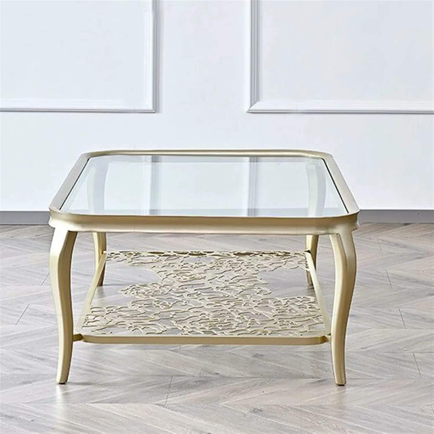 تتميز بتصميم بطبقتين، حيث يوفر الرف السفلي مساحة إضافية للتخزين أو العرض، مما يجعلها خياراً عملياً للمجالس وغرف المعيشة العصرية. كما أن تفاصيل الحفر المجوف (Hollow Carving) في الهيكل تضيف لمسة فنية فريدة تعزز الطابع الفاخر للطاولة دون مبالغة، لتناسب ديكورات مودرن، نيو كلاسيك، وحتى الطراز الفندقي الراقي.