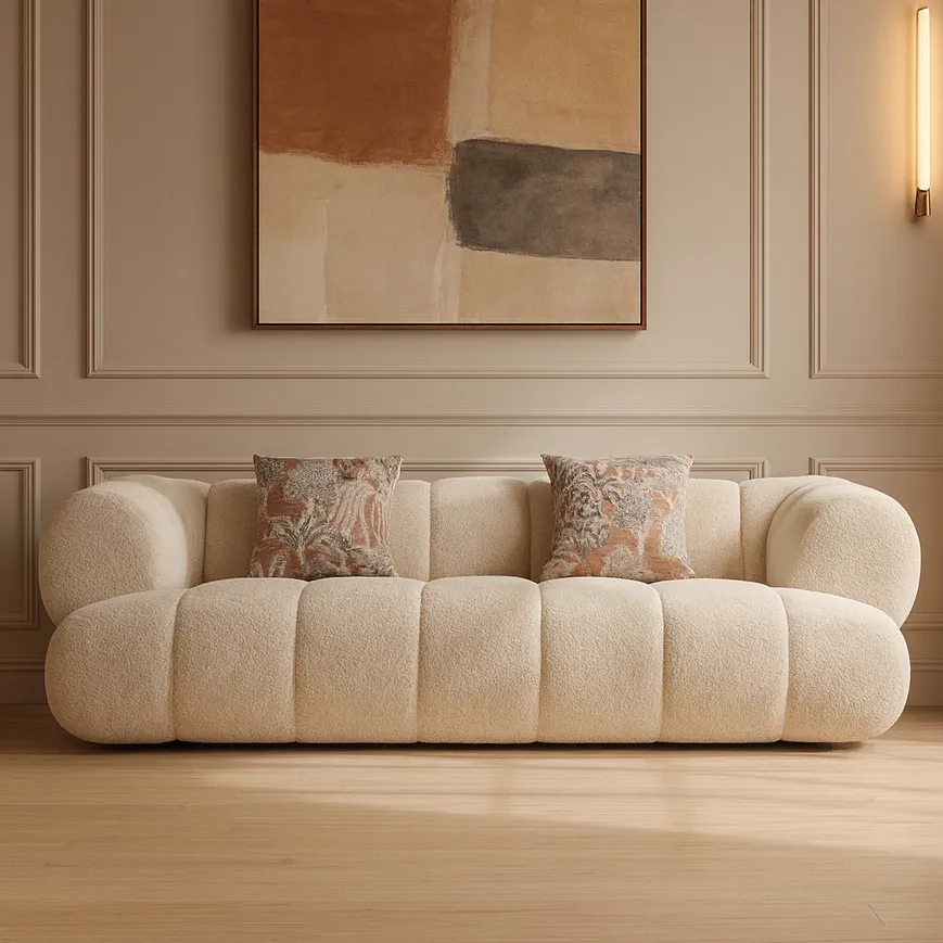 يمنح اللون البيج الكنبة مرونة عالية في التنسيق. يمكنك دمجها مع ألوان فاتحة أو داكنة بسهولة. كما يسمح لك بتغيير الإكسسوارات دون التأثير على شكل المساحة العام.