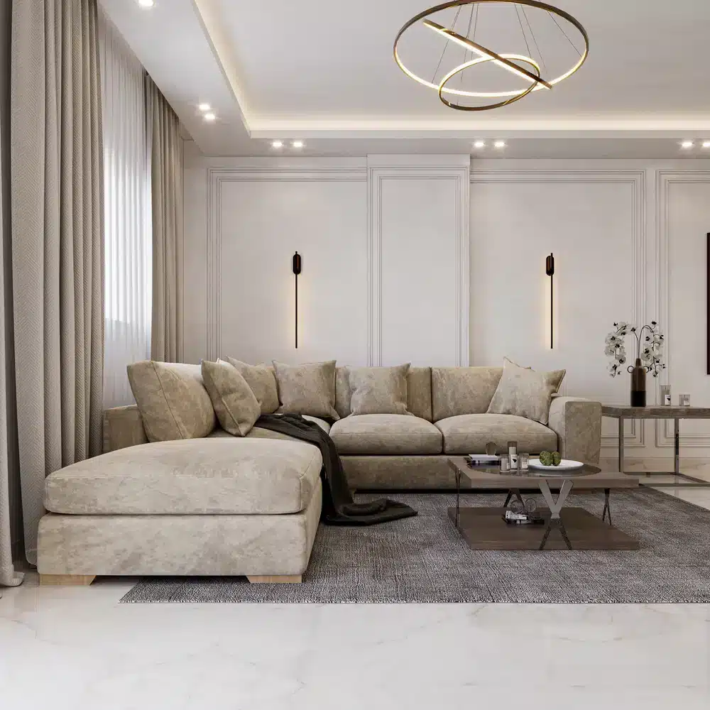 - التصميم العملي: تصميم حرف L يتيح لك الاستفادة القصوى من المساحة، حيث يمكنك ترتيب القطع بشكل يلائم حجم الغرفة.
